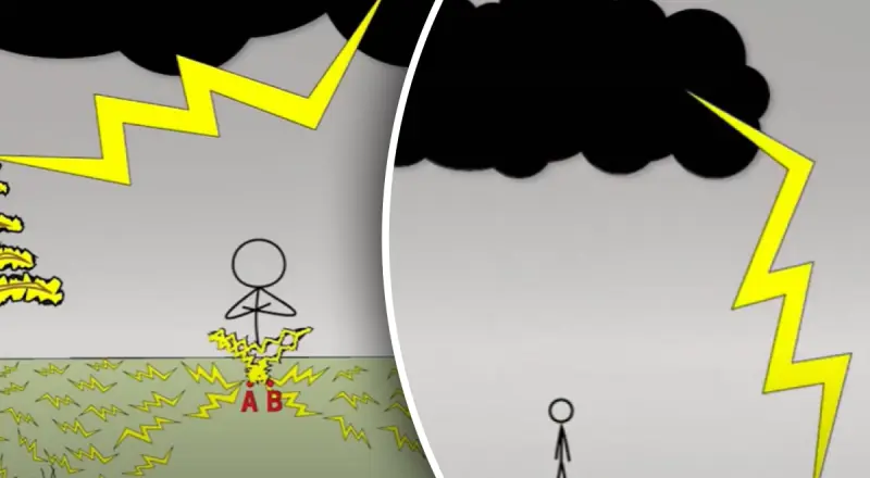 Прямий удар блискавки — рідкісне, але надзвичайно небезпечне явище. Він може спричинити інфаркт, опіки чи зупинку дихання. Більш поширена небезпека — «крокова напруга». Вона виникає тоді, коли блискавка вдаряє в землю неподалік. Електричний струм, що розтікається по поверхні ґрунту, створює різницю потенціалів. Якщо людина стоїть і торкається землі двома ногами, струм може пройти через її тіло. Саме тому лягати на землю під час грози небезпечно: чим більша площа контакту з ґрунтом, тим вищий ризик ураження.